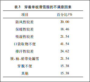 接下來(lái)作者又對(duì)消費(fèi)者穿著單板滑雪服不滿意因素進(jìn)行調(diào)查,結(jié)果如下。