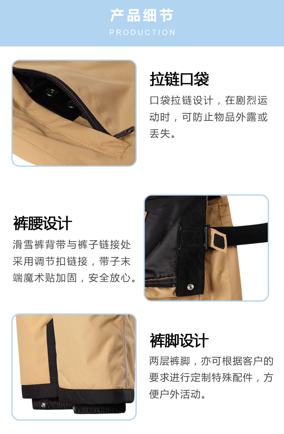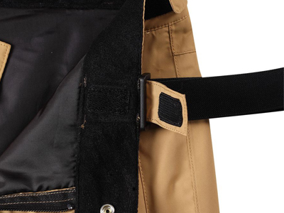 褲腰設(shè)計:戶外滑雪褲加工的背帶與褲子鏈接處采用調(diào)節(jié)扣鏈接,帶子末端魔術(shù)貼加固,安全放心。