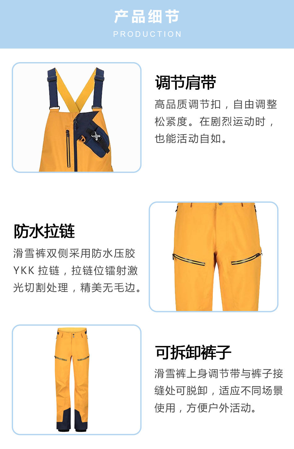 • 可拆卸褲子:滑雪褲上身調(diào)節(jié)帶與褲子接縫處可脫卸,適應(yīng)不同場景使用,方便戶外活動。