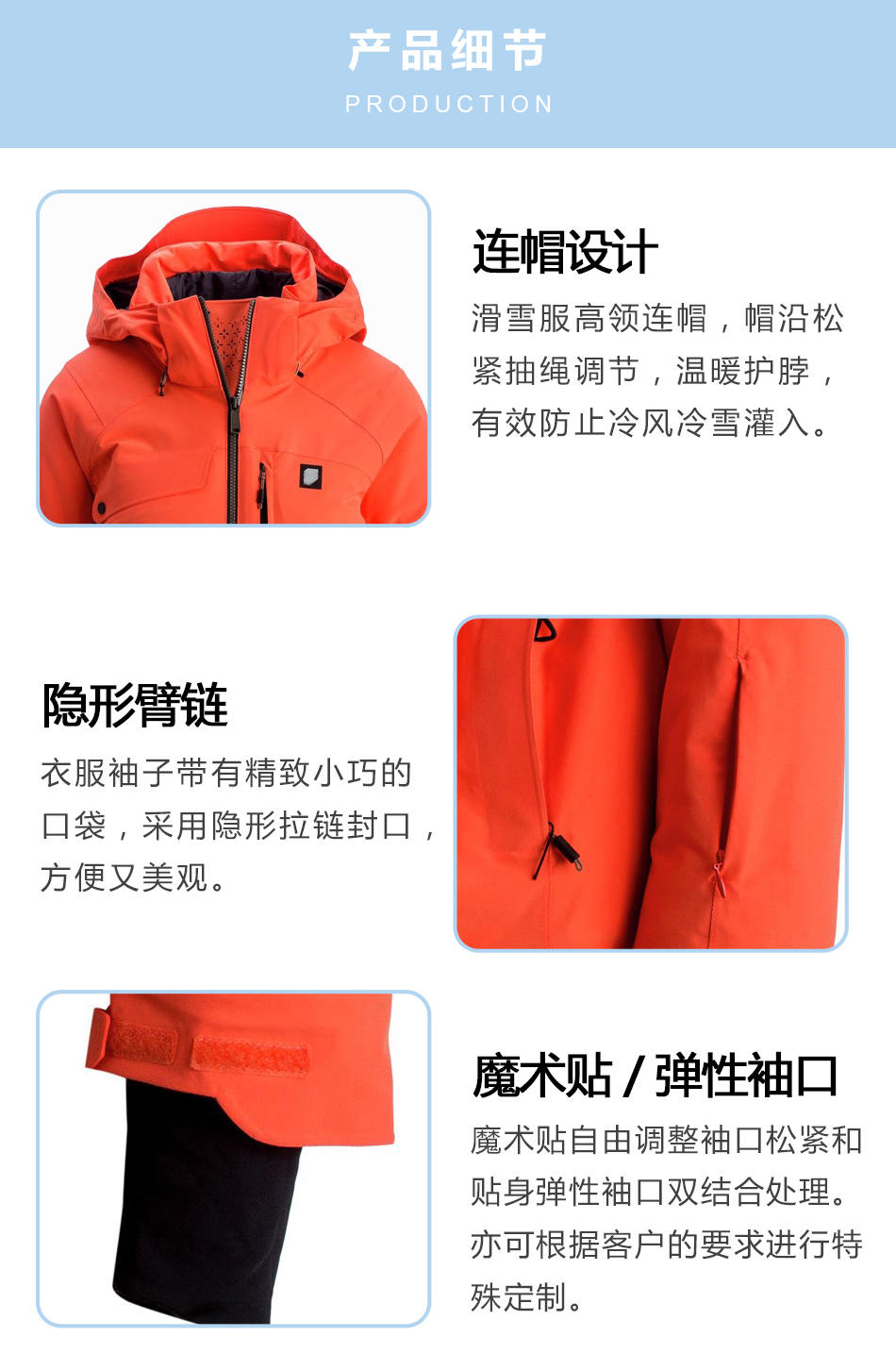 隱形臂鏈:保暖滑雪服生產(chǎn)出衣服的袖子帶有精致小巧的口袋,采用隱形拉鏈封口,方便又美觀。
