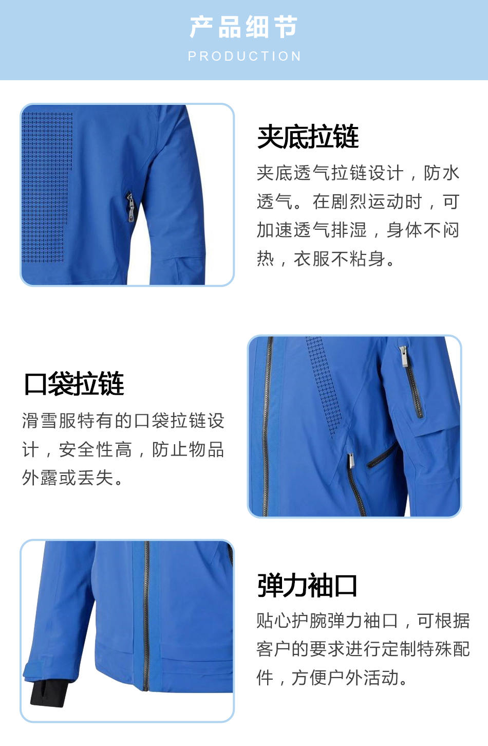 口袋拉鏈:滑雪服生產(chǎn)特有的口袋拉鏈設(shè)計(jì),安全性高,防止物品外露或丟失。